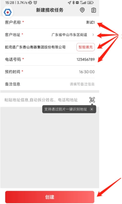 在新建揽收界面,完善客户信息,点击创建。