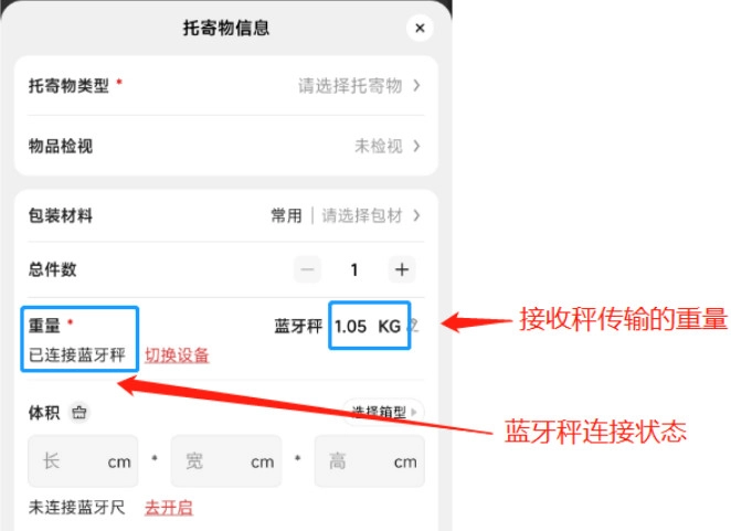 以上是蓝牙秤首次使用时的连接流程,一旦完成过一次连接,后续小哥揽件时,设备会自动连接蓝牙秤并直接获取重量数据,无需再执行上述操作步骤。