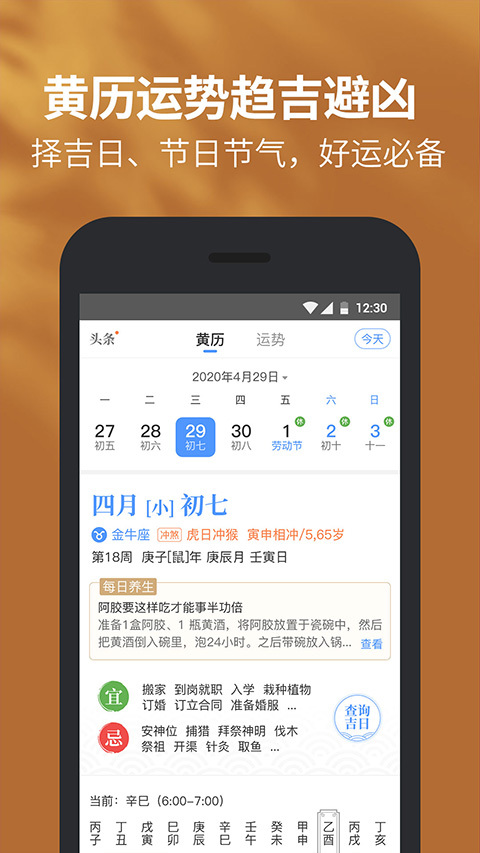 黄历功能:点击黄历板块即可查看今日的日子详情,涵盖每日禁忌、吉祥神方位、吉凶时辰等内容。