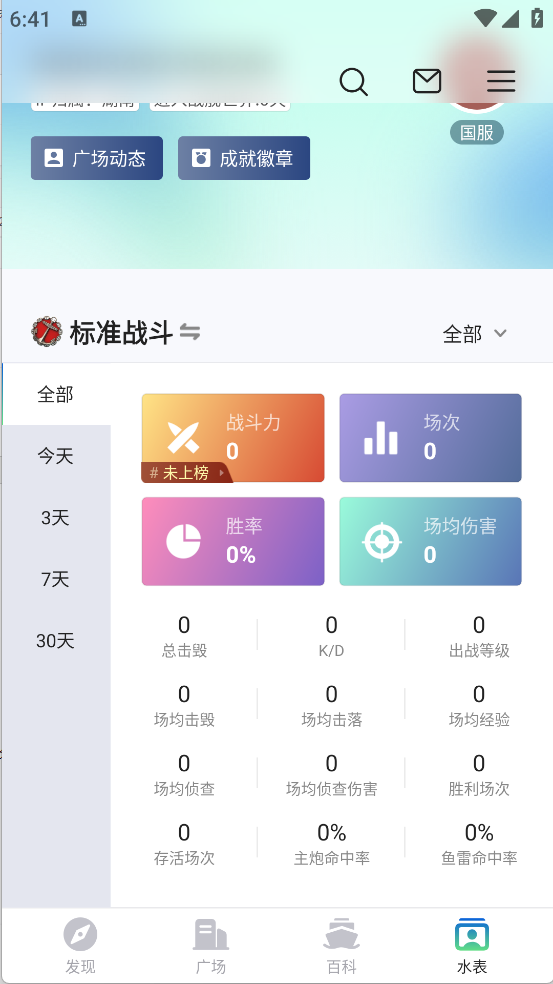 在水表板块登录账号后,可查阅个人战绩情况,其中包含胜率、伤害值、战斗力等战斗数据,还能进行战绩分享操作。