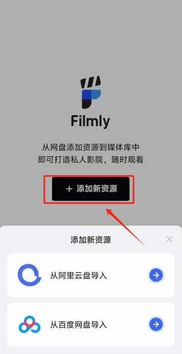 点击「添加新资源」按钮后,Filmly 会弹出可从阿里云盘或百度网盘导入的添加新资源选项。
