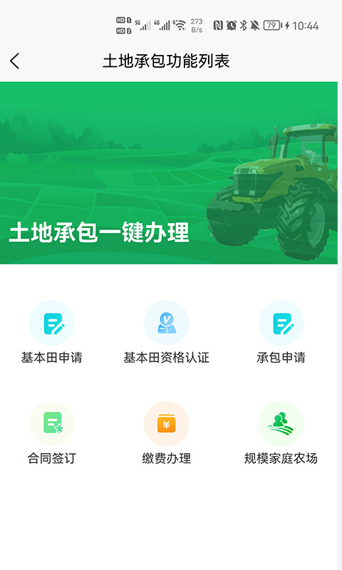 支持土地承包、租赁、买卖等功能,用户可进行土地承包、申请基本土地等操作。