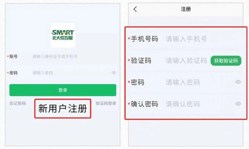 进入注册页面后点击“新用户注册”按钮,接着填写本人手机号码和登录密码等相关信息。