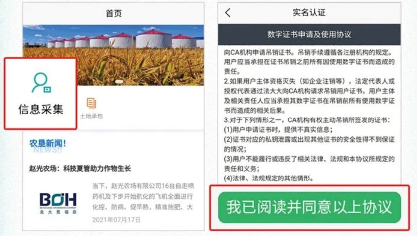 用户注册完成后,需通过土地承包系统端开展实名认证。进入首页后点击“信息采集”,随后进行“实名认证”操作。