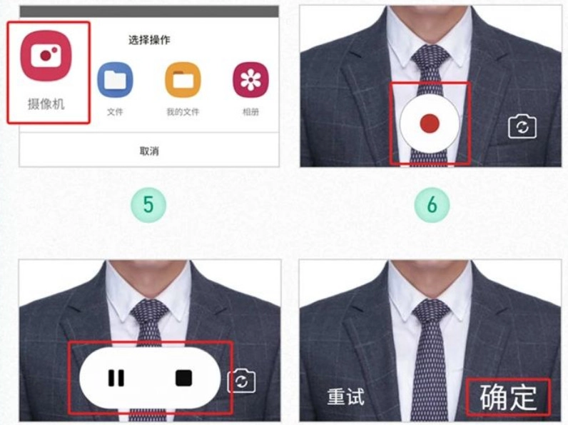 录制视频时,按照“选择相机→开始录制→暂停/停止→点击确定”的步骤操作,即可完成认证。