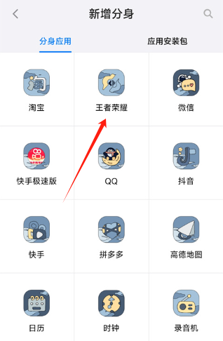添加应用的操作步骤如下:首先在主界面找到并点击“新增分身”按钮,接着在已安装的应用列表里找到“王者荣耀”,最后点击添加即可。