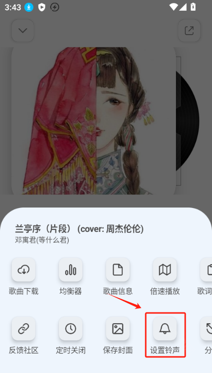 设置铃声的方法是:在播放界面里,点击右下角或者右侧的三个点图标,接着在弹出的菜单中找到并选择“设置铃声”这一选项。