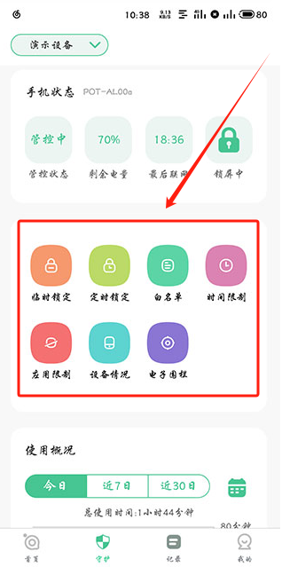 应用限制功能:可以为每个应用单独设置使用时长上限,以此避免孩子过度沉迷;一旦应用使用时间超出预设值,手机便会自动进入锁屏状态。