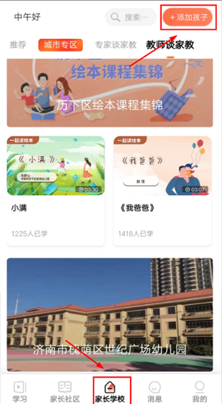 进入家长空间后,家长可以在【家长学校】板块,点击右上角的【添加孩子】按钮,输入班级码,就能加入班级家长群了。