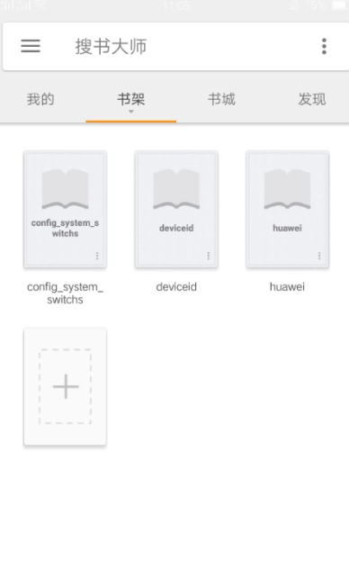 在手机上启动搜书大师应用,进入书架页面后,点击界面上的“+”号图标,具体位置可参考图示。