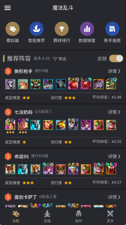 查看羁绊的登场率及前四排名情况,同时了解羁绊效果、技能加成程度与英雄的详细信息。