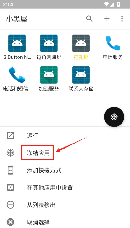点击黑色浮动按钮即可一键冻结列表内的应用程序