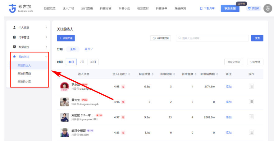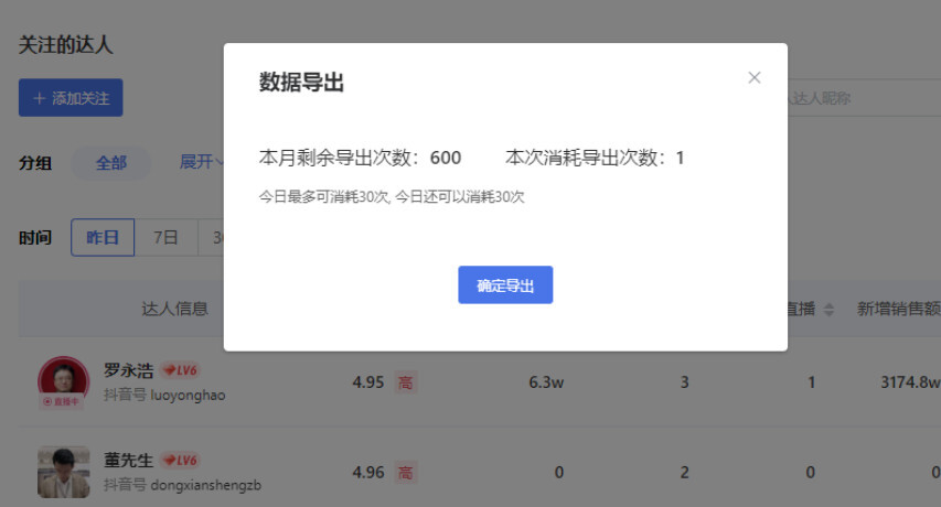 做账号对比、竞品调研等工作时,都需要先搜集数据再进行分析。现在更新后,【关注的达人】【关注的商品】【关注的小店】这些板块的数据都支持自行导出了。
