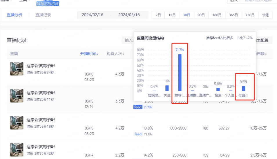 第五步:找到后打开此人的详情,然后进去查看此人直播记录,看他什么时候开始直播的,以及直播的时候流量来源是自然流还是付费的。(如下图)