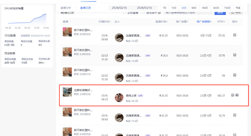 第四步:直播记录中去看,看最近带货数据好的是谁,看有没粉丝数少的以及看非品牌商自播的那种(如下图)