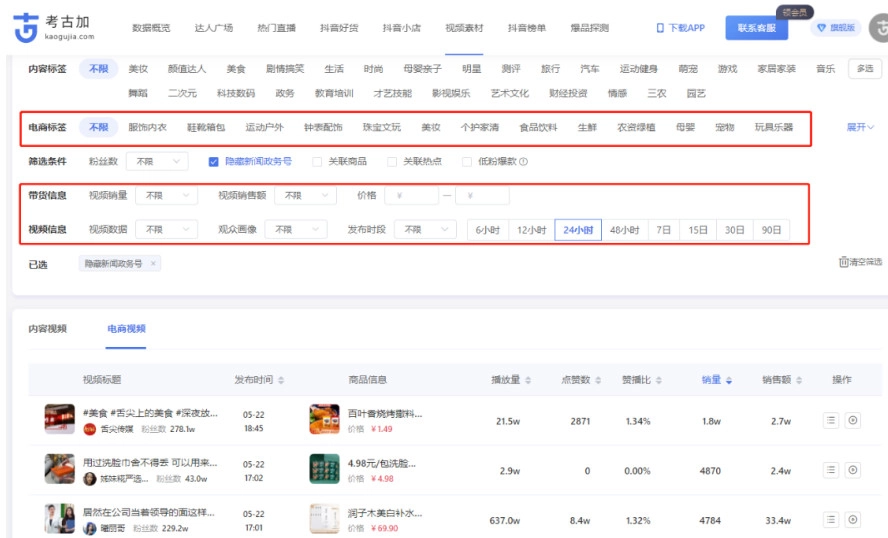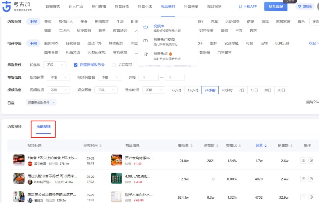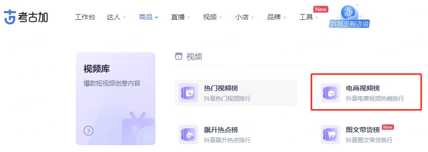 【电商视频】功能是为短视频带货达人量身定制的,能帮助用户快速查找近期带货数据表现出色的短视频。通过它,用户可以迅速掌握近期的爆款视频和商品信息,学习爆款视频的制作模板,还能对未来的爆品趋势进行预测等。