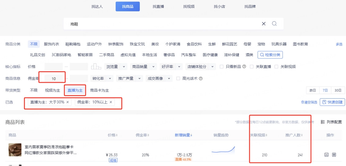 考古加去哪里找爆品?以拖鞋举例:第一步:我们打开考古加回直接搜索拖鞋,拖鞋分男鞋女鞋,所以看你想要做哪种,然后我们需要先定好佣金10%以上,类型为直播为主,然后筛选出来看7日榜单。看完榜单后一定要看推广人数,推广人数只有1个甚至两三个的,这种一般为品牌方自己在直播的,这种不是我们选的,我们选的一定是10人以上的