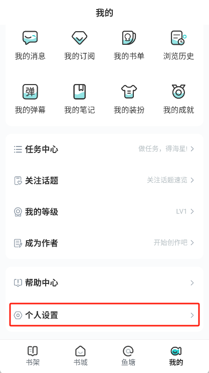 进入个人中心页面后,向下滑动屏幕找到“个人设置”选项,点击该选项即可进入设置菜单。