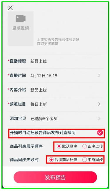 勾选【开播时自动将预告商品发布至直播间】后,可选择【商品列表展示顺序】及设置【商品同步失败时】的处理方式。注意:若未勾选该选项,开播后需手动推送商品至宝贝口袋。