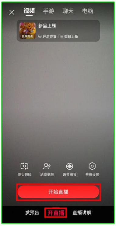 等到达预告的直播时间后,进入快捷入口,在【开直播】界面里调整好直播画面,接着点击【开始直播】按钮就可以了。