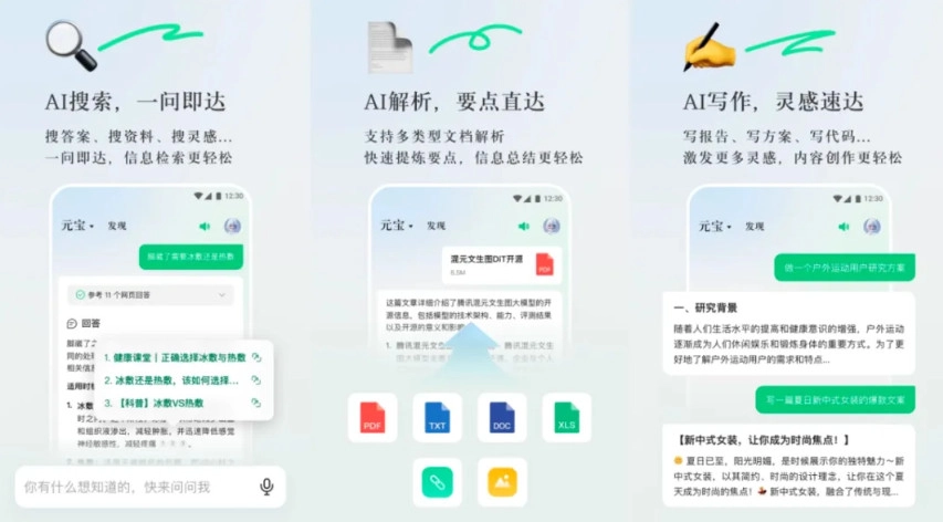 首先,在工作场景下,腾讯元宝提供了 AI 搜索、AI 解析、AI 写作等核心能力。