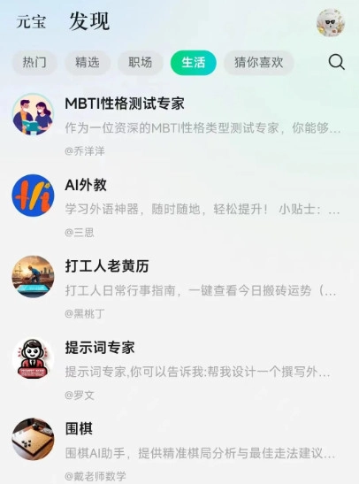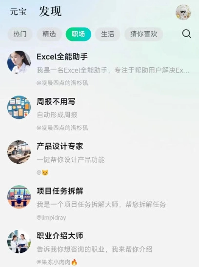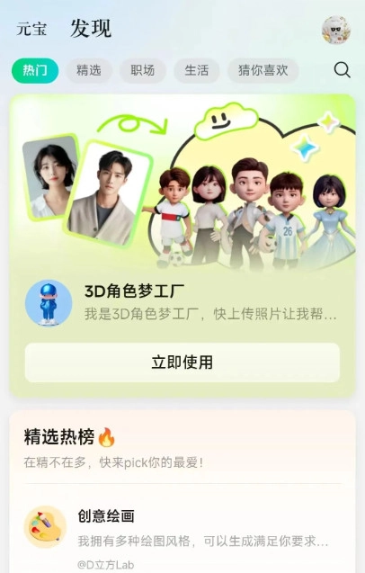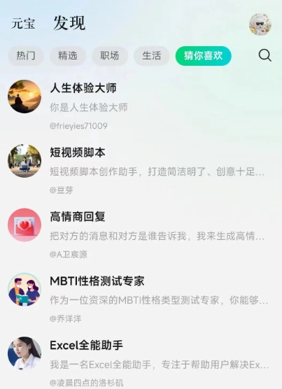 其中,AI搜索接入了微信搜一搜、搜狗搜索等权威搜索引擎,甚至覆盖了微信公众号等腾讯生态内容,同时囊括了其他互联网的权威信源。也就是说,用户在进行AI搜索时,答案的准确性会更高,也会更加全面。与此同时,腾讯元宝还增加了对png、jpg、jpeg、webp、bmp和heic等多种图片格式的识别解析,以及URL解析和对比分析功能,能更好的理解和回答用户的问题。至于AI解析,腾讯元宝具备处理单文档最长1000万字的能力,还支持多类型文档解析,能快速提炼用户想要的要点。AI写作就不必多说了,腾讯元宝能轻松帮你写报告,写方案,写代码……当然,你要以为腾讯元宝只有这点儿本事,那你就小看它了。在发现页面,还有五个模块:热门、精选、职场、生活、猜你喜欢。其中,热门内容展示的主要是筛选出的热榜,包括资讯类、工具推荐、口语陪练等……