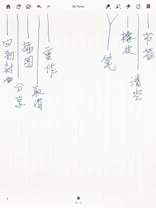 双击笔记即可创建新的空白页面,这与上图中的注释相对应。页面上方的功能列表从左到右依次是:返回封面、分享、上一步与下一步、画笔、马克笔、橡皮擦、清除整页和设置标签。