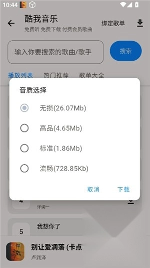 您可以自由选择音质,这里提供无损、高品、标准和流畅四种选项供您挑选。