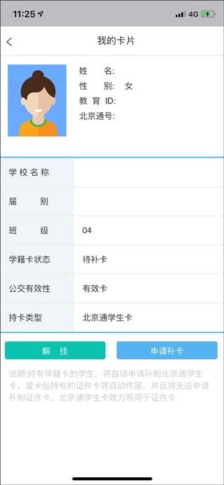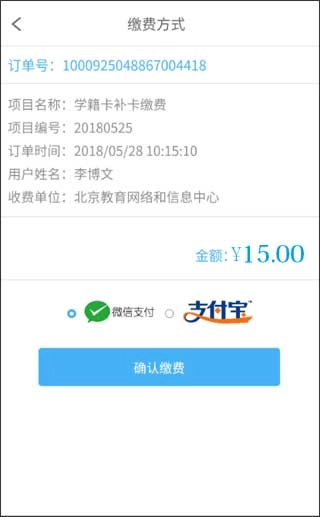 本学期补卡次数超过2次的学生,须前往学校管理员处办理挂失及补卡申请。补卡申请通过后,“北京市中小学云卡系统”将生成缴费订单,学生可自行完成缴费,也可由家长或学校代为缴纳。