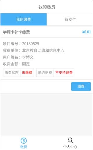 进入“缴费”栏目后,找到【待支付】模块,在这里能看到缴费中途暂停的订单,点击【缴费】按钮即可继续完成缴费流程。