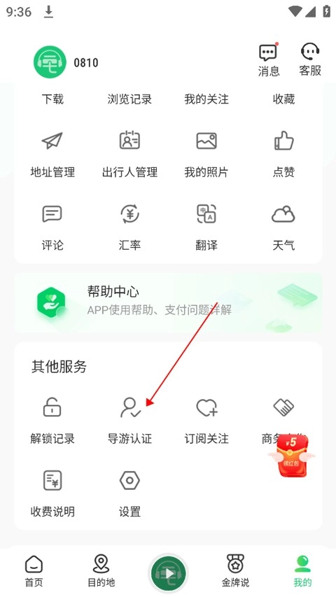 首先打开软件完成注册与登录操作,接着点击页面下方的【我的】选项,然后向下滑动页面至底部,找到并点击【导游认证】按钮。