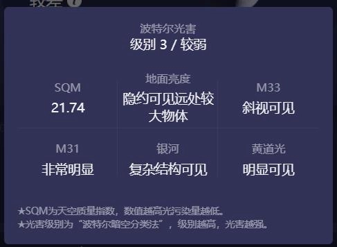 你可以在上方图片右上角的胶囊形状区域看到光污染的等级与概况,点击该区域即可查看详情。