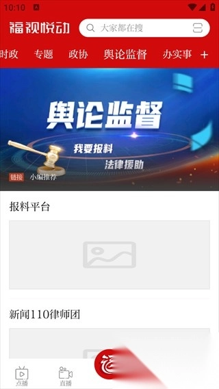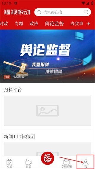 进入【福视悦动】首页后,能够浏览【舆论监督】等板块的内容,点击底部导航栏中的【我】,即可进入个人功能页面。