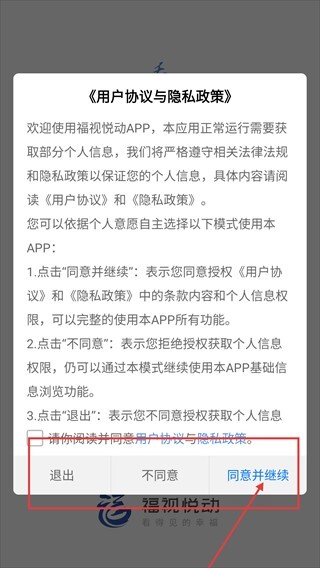 打开【福视悦动】应用后,仔细阅读【用户协议与隐私政策】,在勾选同意相关条款后,点击【同意并继续】按钮,就能解锁软件的全部功能并正常使用。