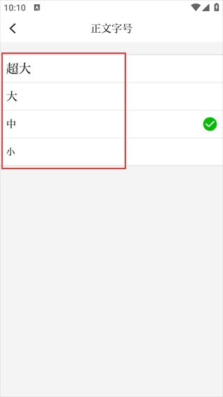 进入【正文字号】页面后,能选择【超大】【大】【中】【小】字号,根据需求进行调整,目前默认选中的是【中】字号。