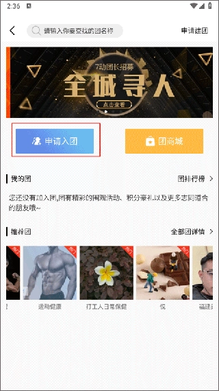 申请入团分为“全部团”和“推荐团”两种类型,选择其中一个团队即可进入详情页面。