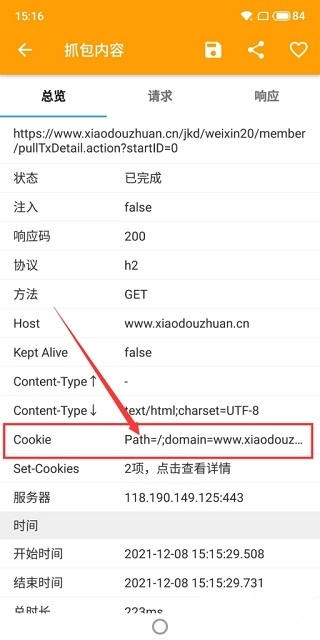 小黄鸟(HttpCanary)最顶部的数据包,点击进入后能看到一个cookies,这就是我们要找的内容。