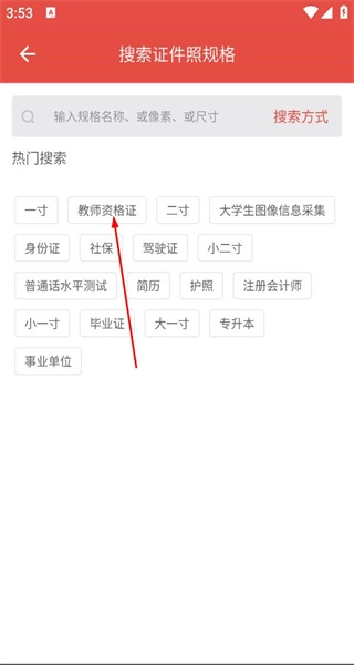 进入证件照规格搜索页面后,热门搜索区域陈列着多种证件类型,从中选择教师资格证这一选项,即可进入该证件所对应的规格列表页面。