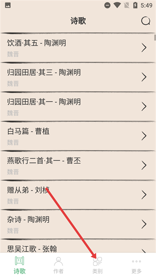 在诗歌列表页面,能够查看多首魏晋时期的诗歌,点击底部的【类别】选项,即可切换到诗歌的朝代分类页面。