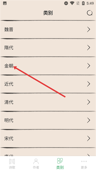 在类别页面能看到【魏晋】-【隋代】之类的朝代选项,选定【金朝】后,就会进入这个朝代对应的诗歌列表页面。