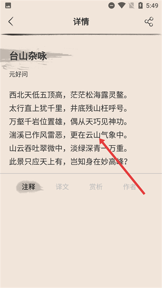 在诗歌详情页面,你可以查看《台山杂咏》的具体内容,并且能够切换【注释】【译文】等标签,从而了解到这首作品的更多相关信息。