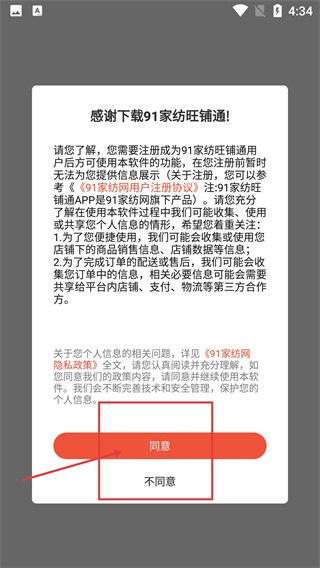 在91家纺旺铺通的初始弹窗里,要阅读《91家纺网用户注册协议》并点击【同意】按钮,才能继续使用该应用。