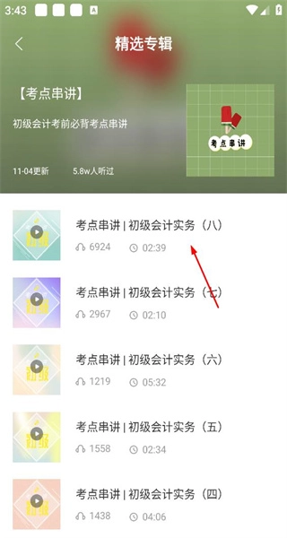 进入考点串讲专辑的详情页面后,会呈现出初级会计实务的相关音频列表,每个音频都标注了播放量和时长,挑选对应的音频就能开始收听。