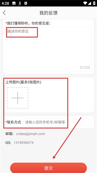在意见反馈页面的输入区域填入【描述你的意见】,填写好【联系方式】后,点击【提交】按钮,即可把反馈内容提交到平台,从而完成整个意见反馈流程。