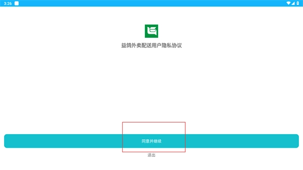 阅读《益鸽外卖配送用户隐私协议》后,点击“同意并继续”按钮,进入后续流程。
