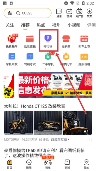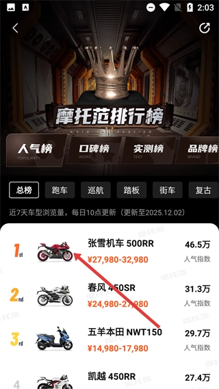 在应用首页找到并点击【排行榜】选项,进入“摩托范排行榜”页面后,就能查看不同榜单对应的车型排名情况。