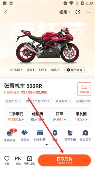 在人气榜的排行榜中,点击位列榜首的“张雪机车 500RR”条目,进入该车型的详情页面,查看它的价格、参数等相关信息。