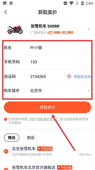 在车型详情页中点击页面底部的【获取底价】按钮,即可进入“获取底价”的信息填写界面。