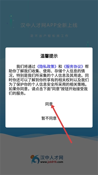 阅读《隐私政策》和《服务协议》的相关说明后,点击【同意】按钮,接受相应条款,就能进入汉中人才网。