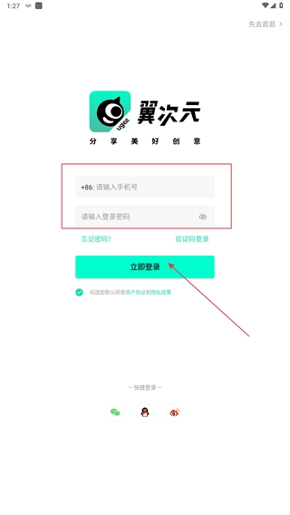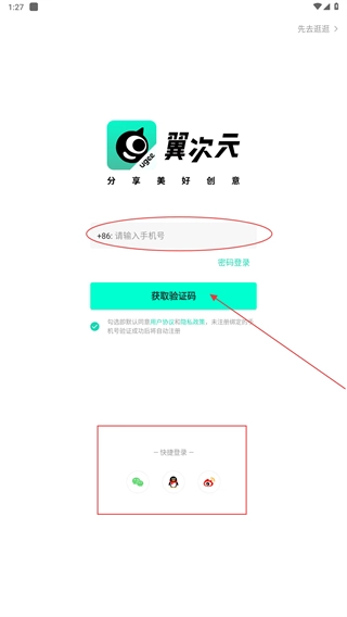 在翼次元的登录页面,您可以选择两种登录方式:一种是短信验证登录,操作步骤为输入手机号后点击【获取验证码】;另一种是通过微信、QQ等快捷方式直接登录。